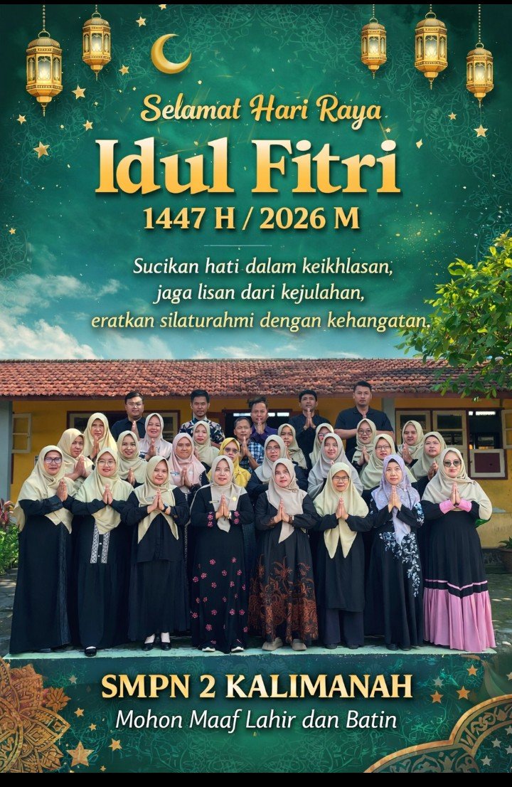 Dalam suasana penuh kebahagiaan dan kehangatan Hari Raya Idul Fitri 1447 Hijriah, keluarga besar SMPN 2 Kalimanah menyampaikan ucapan selamat kepada seluruh masyarakat, orang tua siswa, serta para peserta didik.
